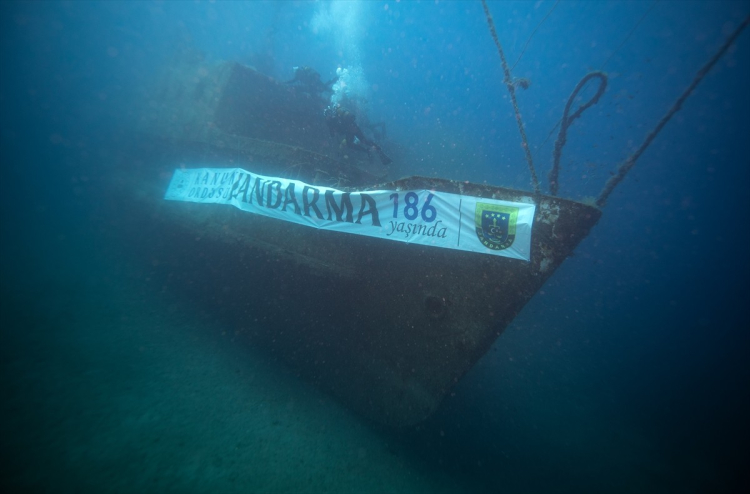 Yaklaşık 30 metre derinlikte bulunan vapurun burun kısmında, "Kanun Ordusu Jandarma 186 Yaşında" yazılı pankart açıldı. Ekipler, su altında Türk bayrağı ve Atatürk portresi de açarak saygı duruşunda bulundu.